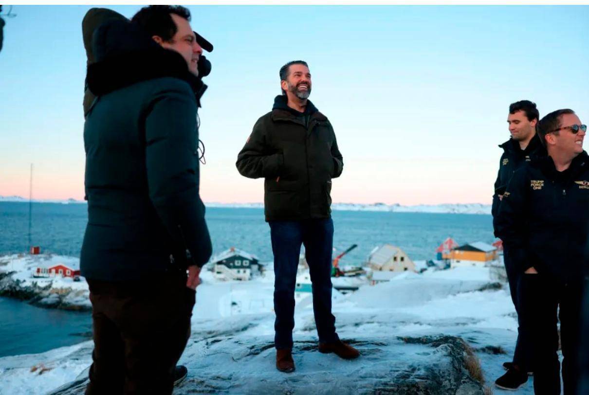 特朗普的长子(中)抵达格陵兰岛首府努克(图片来源:参考消息援引外媒)